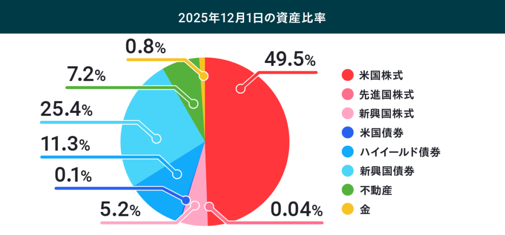 基本的には毎月ポートフォリオを変更しています。例えば、2025年12月1日のポートフォリオは以下の用になっています。自分でこのような細かいリバランスは無理ですね。根拠もつけられない。