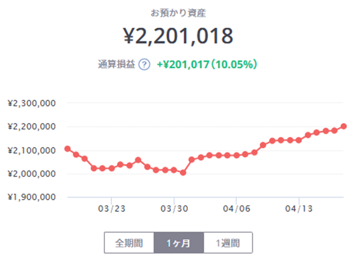 4月は上げ一辺倒ですね。株式がグイグイ戻してきてます。25年11月からの運用で10%です。運用来の最高値です。