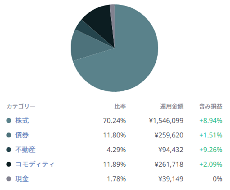 4月からは株式70%、債券10%、金10%に不動産4%程度と、不動産が組み入れられています。