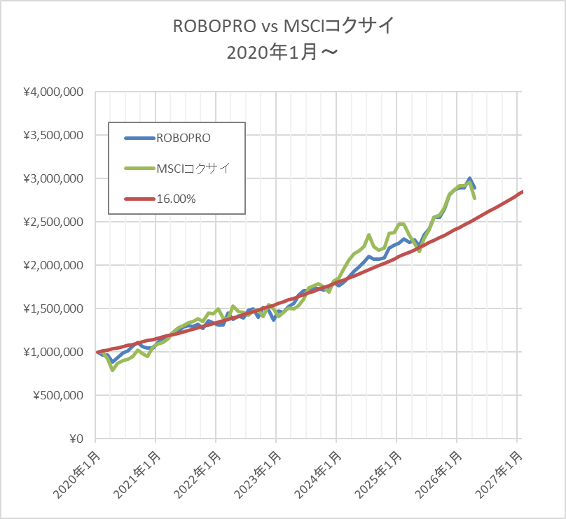 私のメインの投資対象であるMSCIコクサイとの比較です。手数料が取られててこの成績です。元の成績はROBOPRO優位でしょうね。手数料を取られることで、MSCIコクサイと同程度のリターンとなっていますが変動が少ないので、手数料を取られてもROBOPROのほうが優秀でしょう。